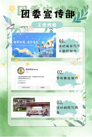 宣传部旨在关注校园热点、传递青春信息、反应学院动向。推送、海报、拍照......哪里有宣传,哪里就有我们!